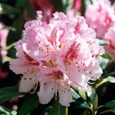 Цветение радует глаз с конца мая и продолжается около месяца. Обильные крупные соцветия, в которых размещается от 10 до 15 цветов, создают завораживающее зрелище. Каждый цветок размером около 6,5 см с изящной розовой окраской при полном раскрытии выглядит особенно выразительно – верхние лепестки темнее нижних, дополнены ярким бордовым «глазком». Это делает Рододендрон Чир настоящей звездой любого сада.