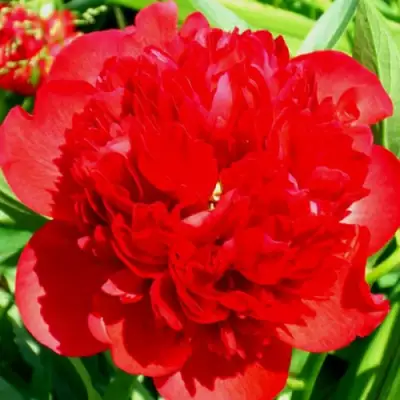 Цветы этого пиона особенно впечатляют. Они махровые, розовидные, ярко-красного цвета с легким оранжевым отливом, достигающие в диаметре 12-14 см. Их бомбовидная структура кажется нарядной и плотной, а блестящие лепестки добавляют цветку дополнительного блеска. Мягкая и бархатистая резная структура лепестков делает каждый цветок уникальным. Идеально подходящие для срезки, цветы обладают сладким фруктовым ароматом, остающимся стойким на протяжении долгого времени.