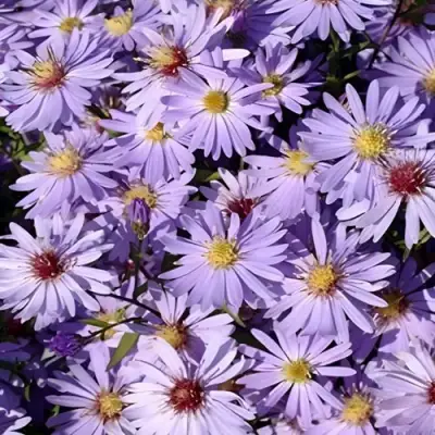 Цветы — главная особенность Блю Хевен. Мелкие, диаметром около 2 см, они собраны в густые соцветия, почти полностью закрывающие зелёную массу. Окрас лепестков — сложный: голубой с лавандовым подтоном, который в вечернем свете уходит в дымчатую сирень. Центр цветка — солнечно-жёлтый, позже приобретает лёгкий красноватый оттенок. Цветение продолжительное — до 8 недель, начинается в конце августа и может продолжаться до октября. Аромат лёгкий, травянисто-свежий, почти незаметный на расстоянии, но уловимый вблизи.