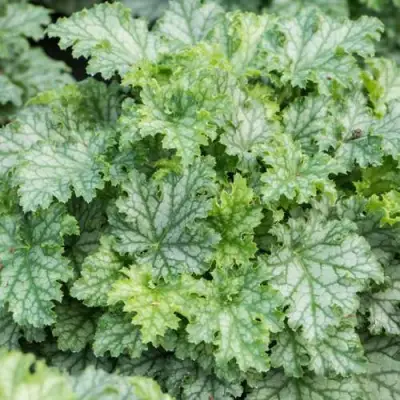 Гейхера Лайм Свизл - очень эффектная новинка 2017 года, сорт польской селекции серии Supplement. Цвет ярко-зеленый с серебром, листья крупные, красивой формы - похожи на кленовый лист, очень гофрированные. Цветки сливочно-белые. Растет быстро, неприхотлив.