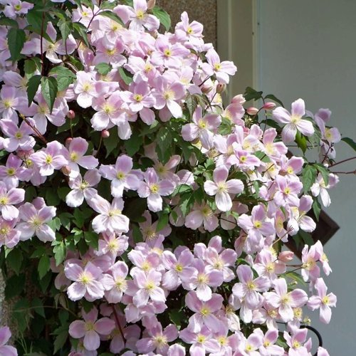 Весной клематис полностью меняет вид. На прошлогодних побегах распускаются сотни мелких звёздчатых цветков диаметром около 4–6 см. Оттенки варьируются от бело-розовых до нежно-розовых, а полупрозрачные лепестки подчёркивают лёгкость и свежесть цветения. В условиях Беларуси основной пик наступает в конце мая — это время, когда сад только набирает краски, и клематис становится одним из первых ярких акцентов. Цветение продолжается несколько недель, выглядит очень насыщенно и заметно выделяет участок среди ещё не полностью расцветших растений. У ряда сортов чувствуется мягкий сладковатый аромат.